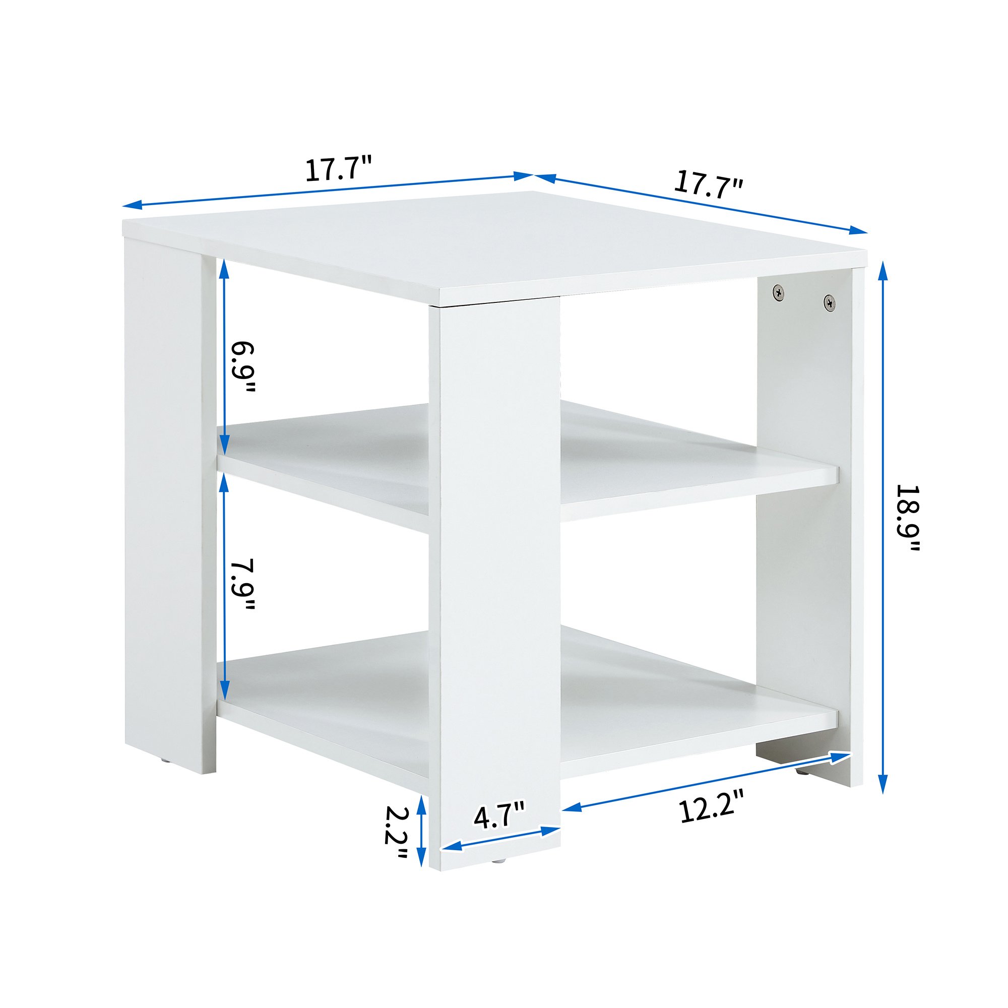 [Sturdy And Durable]:This side table is made of high quality wood.Made of 15mm high quality particle board. Guarantees Sturdiness and Stability. This nightstand is long-lasting.Product Size: 17.7''W x 17.7''D x 18.9''H.[Simple Style Design]:This square end table designed with simple straight lines style.The white is very popular.The design of this product is unique in the design of the table legs.Make this side table more stable; weight capacity:88pounds. [Easy To Clean]:This side table has a smooth surface for easy daily cleaning.[Easy To Assemble]:With simple construction and clear instructions .With illustrated instructions; Can be installed easily. All hardware and assembly instructionsare provided.[Wide Application]:Suitable for dining room; living room; office; bedroometc.Especially sofa side; living room; bedroom; reception room and so on. Very popular with people.